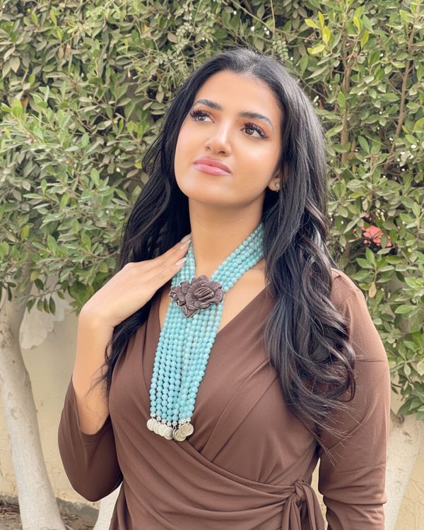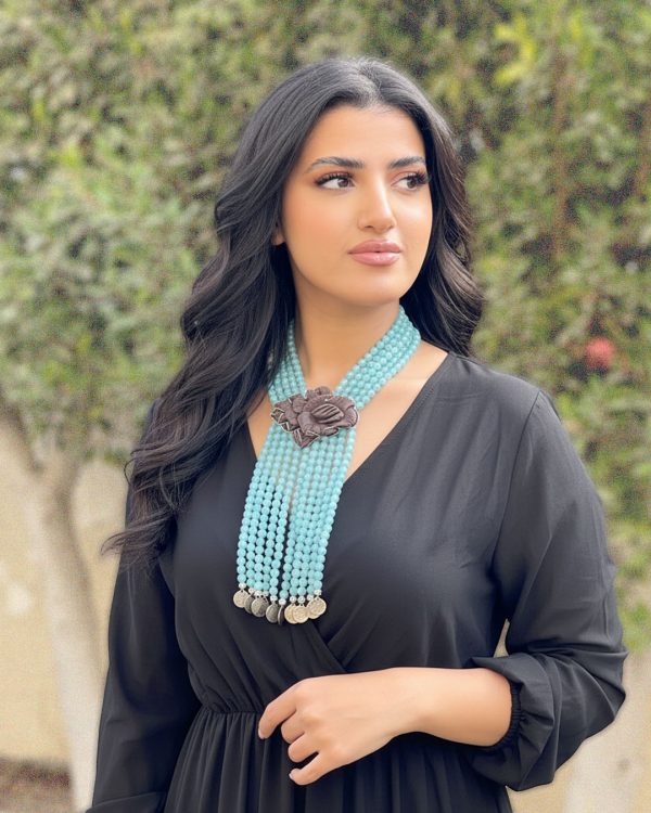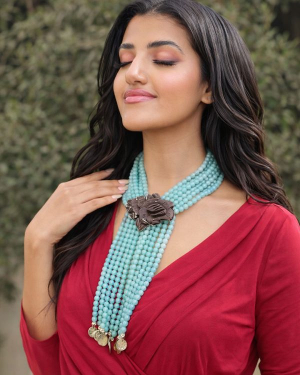 Celestial Bloom is a tribute to feminine power in its most radiant form. Handcrafted with cascading strands of serene blue agate, the necklace drapes fluidly along the body, creating movement, grace, and effortless presence.
